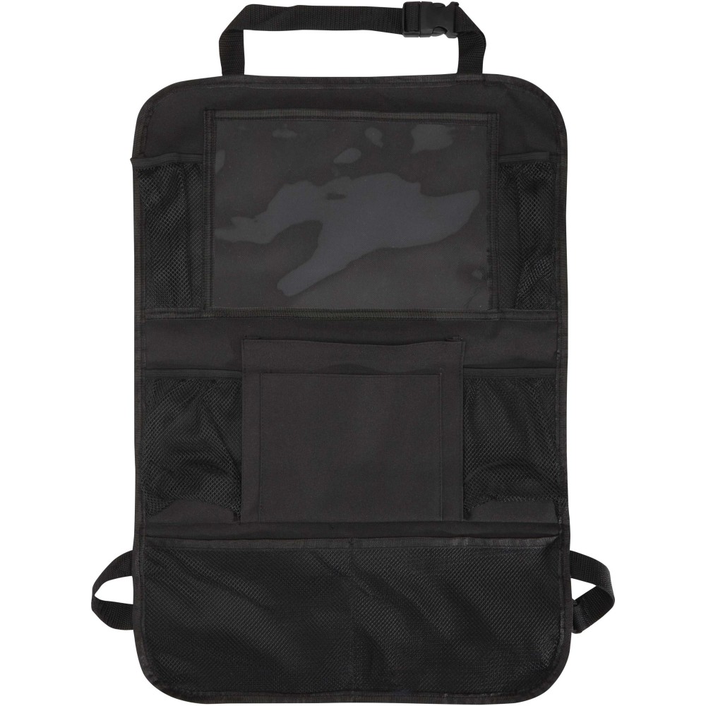 Autós háttámla-rendszerező, amely több hálós zsebbel rendelkezik az alapvető kellékek, például snackek, játékok vagy palackok tárolására, valamint egy PVC-ablakkal tablet számára. Könnyen az első üléshez rögzíthető, és segít rendben, illetve rendezetten tartani az autót - ideális választás családoknak, utazásokhoz vagy mindennapi használatra.