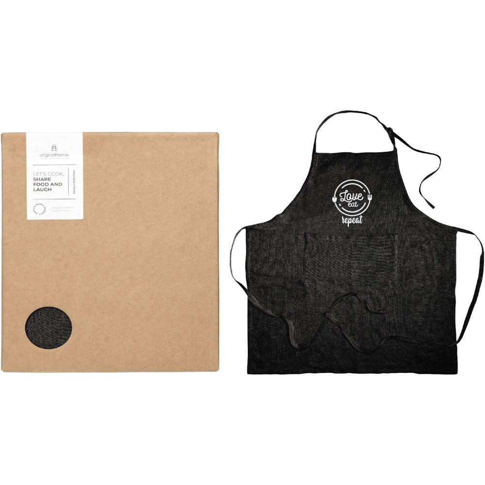 Ez a 100%-ban a bangladesi ruházati iparból származó, újrahasznosított anyagokból készült kötény hagyományos kézi szövőszéken készül, így a termék megvásárlása a helyi női vállalkozók tevékenységét támogatja. A professzionális megjelenésű konyhai kiegészítő ideális társadalmi felelősségvállalást tükröző ajándék, amely egyszerre szolgálja a fenntarthatósági és a szociális célokat. A terméket esztétikus ajándékdobozban szállítjuk. Az anyagösszetétel 70% újrahasznosított pamut, 25% újrahasznosított poliészter és 5% egyéb újrahasznosított rost.