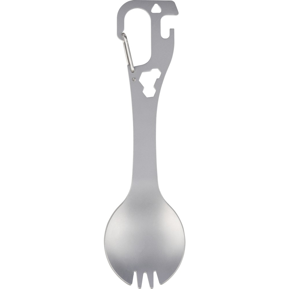 Rozsdamentes acélból készült spork (kanál - villa kombináció) integrált villával és kanállal, valamint beépített lapos csavarhúzóval, üveg- és konzervnyitóval, továbbá három hatlapú kulccsal a nyélben. Karabinerrel ellátva. Darabonként papírtasakba csomagolva.