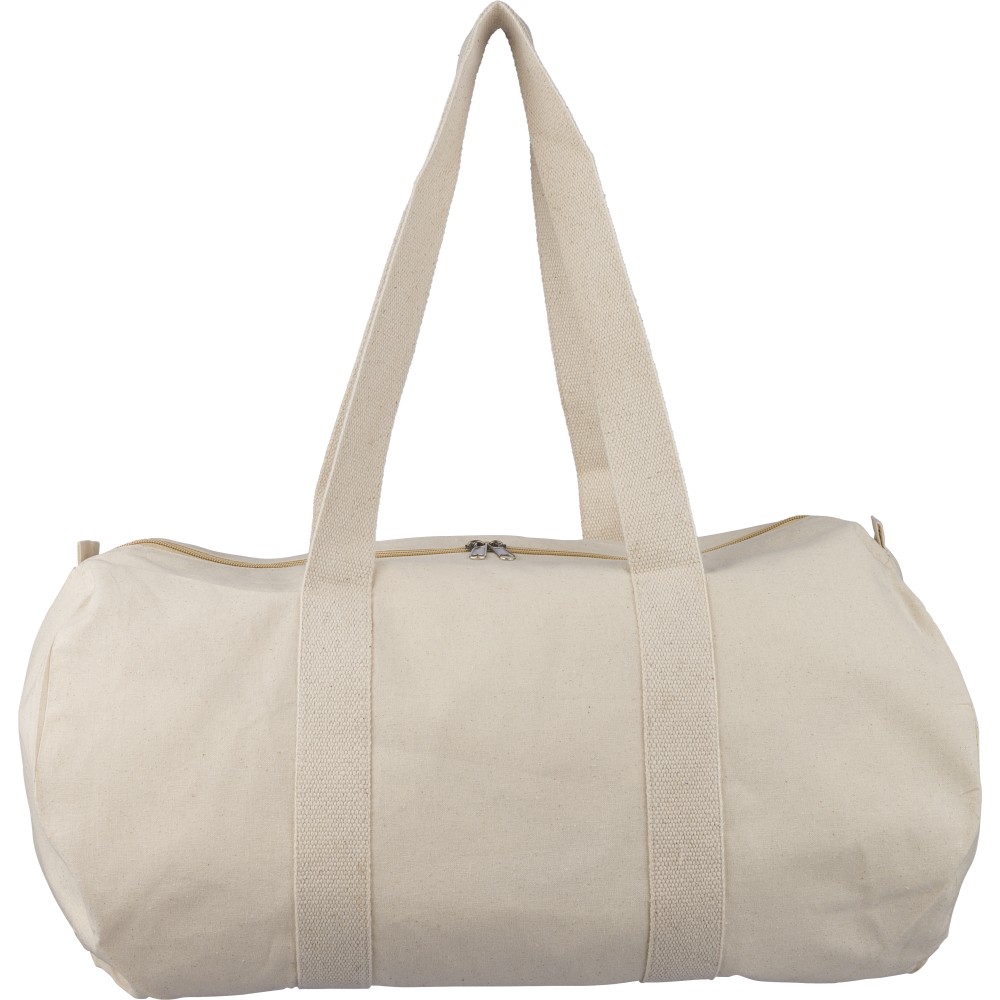 Oeko-Tex minősítésű, 180 g/m2 pamutból készült natúr színű, cipzáras sporttáska 60 cm hosszúságú és 5 cm szélességű pamutfülekkel. Oeko-Tex címkével ellátva.