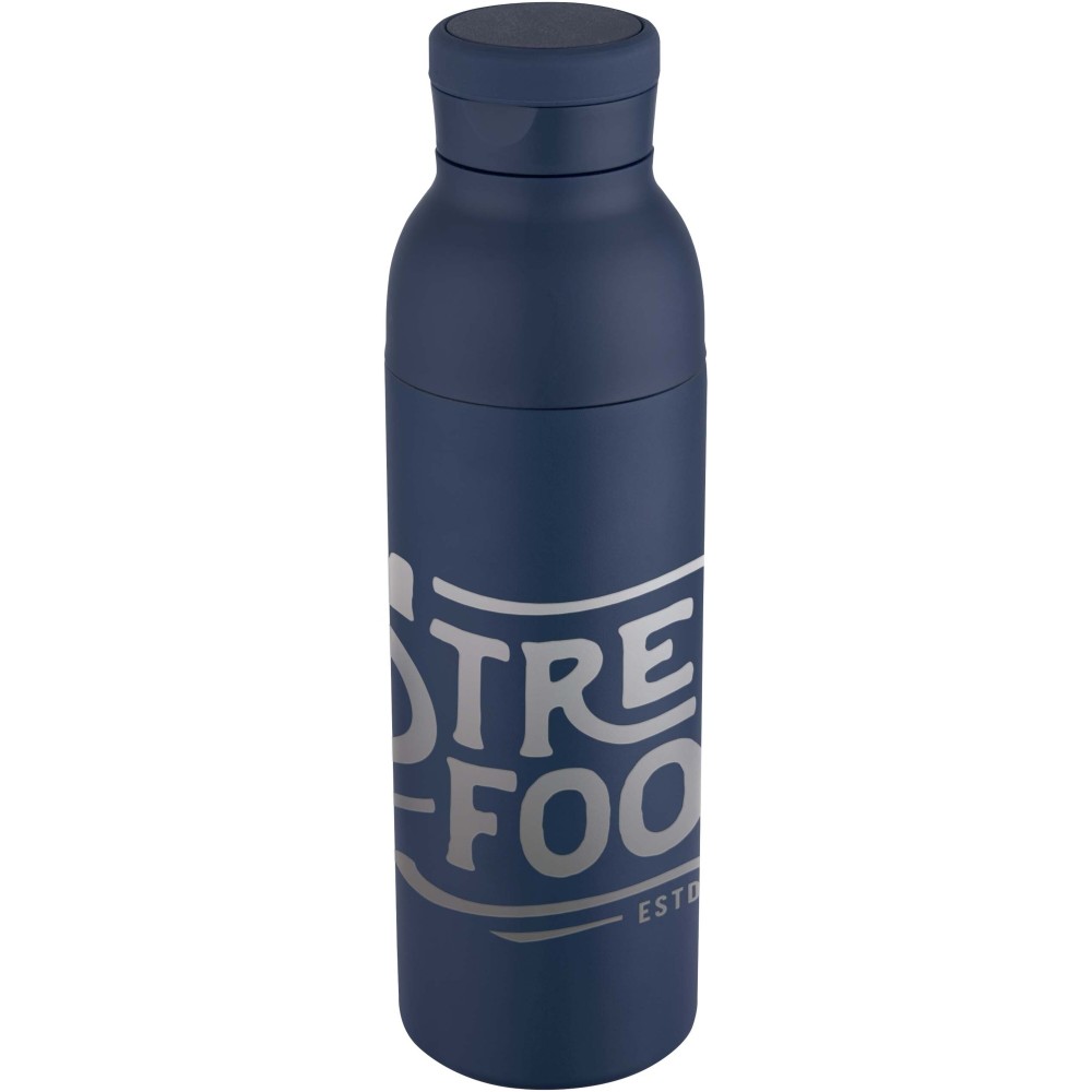 RCS tanúsítvánnyal rendelkező rozsdamentes acélból készült, duplafalú, vákuumszigetelt palack, amelynek fedelén egy diszkrét, beépített szilikon fogantyú található. Az italokat 48 órán át hidegen, vagy akár 12 órán keresztül melegen tartja. A két részből álló konstrukció megkönnyíti a tisztítást, míg a tartós porszórt bevonat és a belső rézszigetelés hosszú élettartamot és kiváló hőtartást biztosít. A terméket újrahasznosított kartonból készült ajándékdobozban szállítjuk. Űrtartalma: 650 ml.